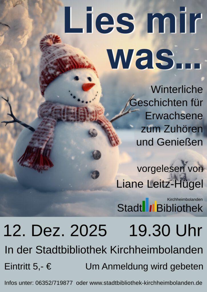 Frau Leitz-Hügel wird uns dieses Mal mit wunderschönen winterlichen Geschichten verzaubern. Lassen Sie sich von ihren Worten in eine stimmungsvolle Welt entführen und genießen Sie einen gemütlichen Abend in der Stadtbibliothek Kirchheimbolanden.